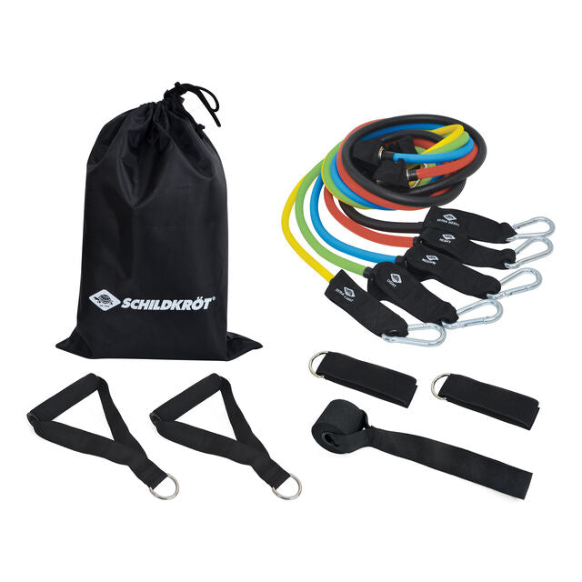 Enhance your workout with a wide range of 29 resistance levels. This set includes 5 bands, 2 handles, 2 foot straps, and 1 door anchor, making it suitable for all fitness levels. Also included are a carrying bag and exercise tips for convenience. The packaging features training tips and a QR code for accessing exercise videos. The 5 band set is 120cm in length, and a carry bag is included for easy transport.