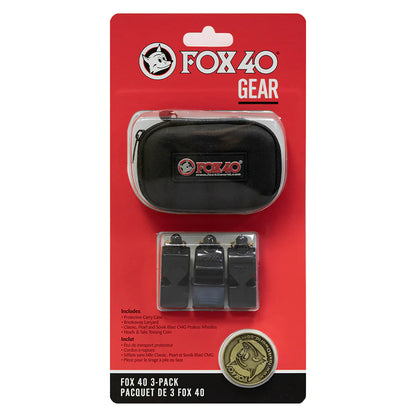 This whistle kit comes with three different Fox 40 pealess whistles offering unique whistle tones for multi-court or multi-field situations, all bringing the famous reliable and consistent penetrating sound. Also included is a unique Fox 40 branded 'heads and tails' tossing coin made from die-cast antique brass, and logo breakaway lanyard made of strong non-kinking material with black hardware.